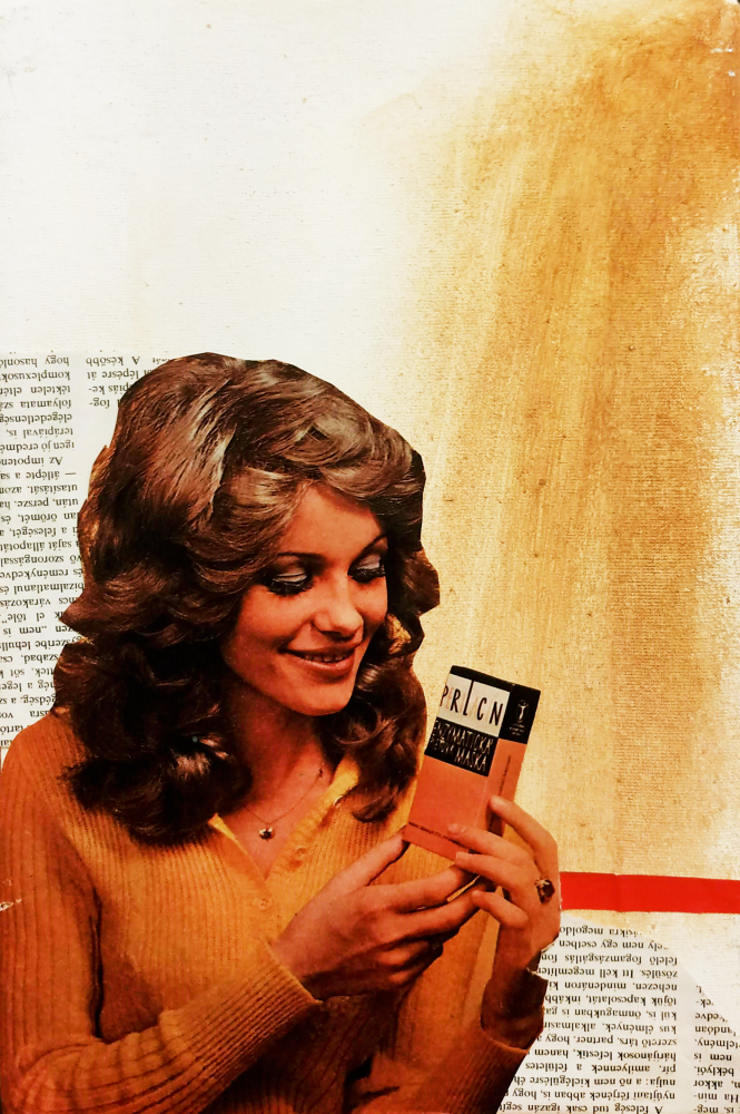 My collages associate with and shape themselves in relation to today's society, with some irony and satirical tone. I combine traditional painting techniques with the modern, glossy, and shiny world. I try to present this duality in a harmonious way. My works are usually based on printed photos and headlines, or even full pages of women's magazines that have attracted my interest. The final image is formed in my head based on a fragment of a photo or title, or even the color of a page which I must in all conditions liberate from the magazine's captivity to raise all this to a higher level: the perfection created by mass media.