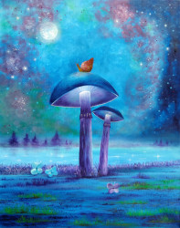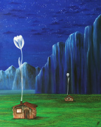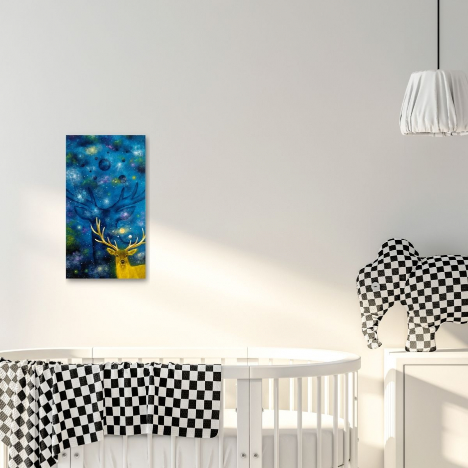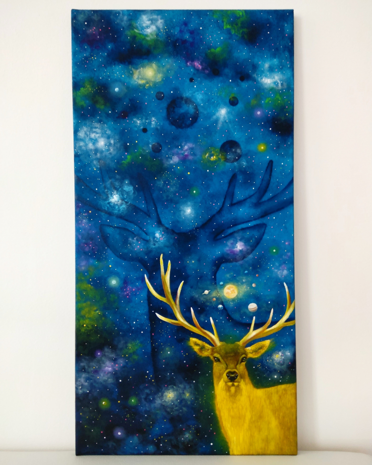 “Ruler III” is one of the paintings of the “Ruler” series. This series consists of oil paintings with surrealistic style and were created on canvas. They are inspired by nature and they illustrate a reindeer in different places. All the paintings give you ethereal vibes and create a magical atmosphere. In this painting the reindeer is in the night sky.