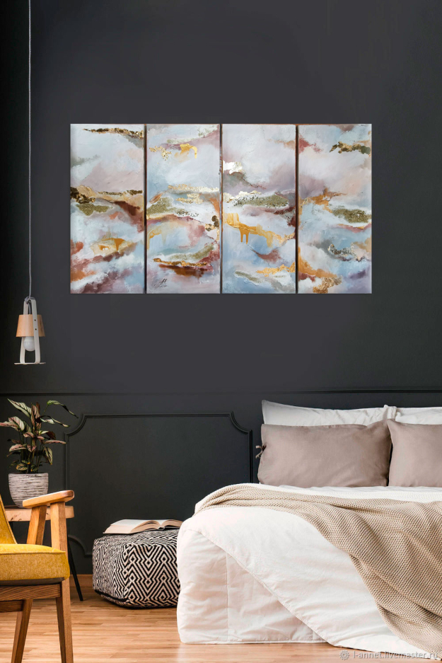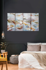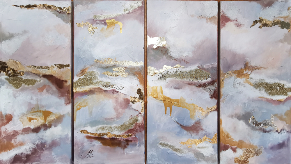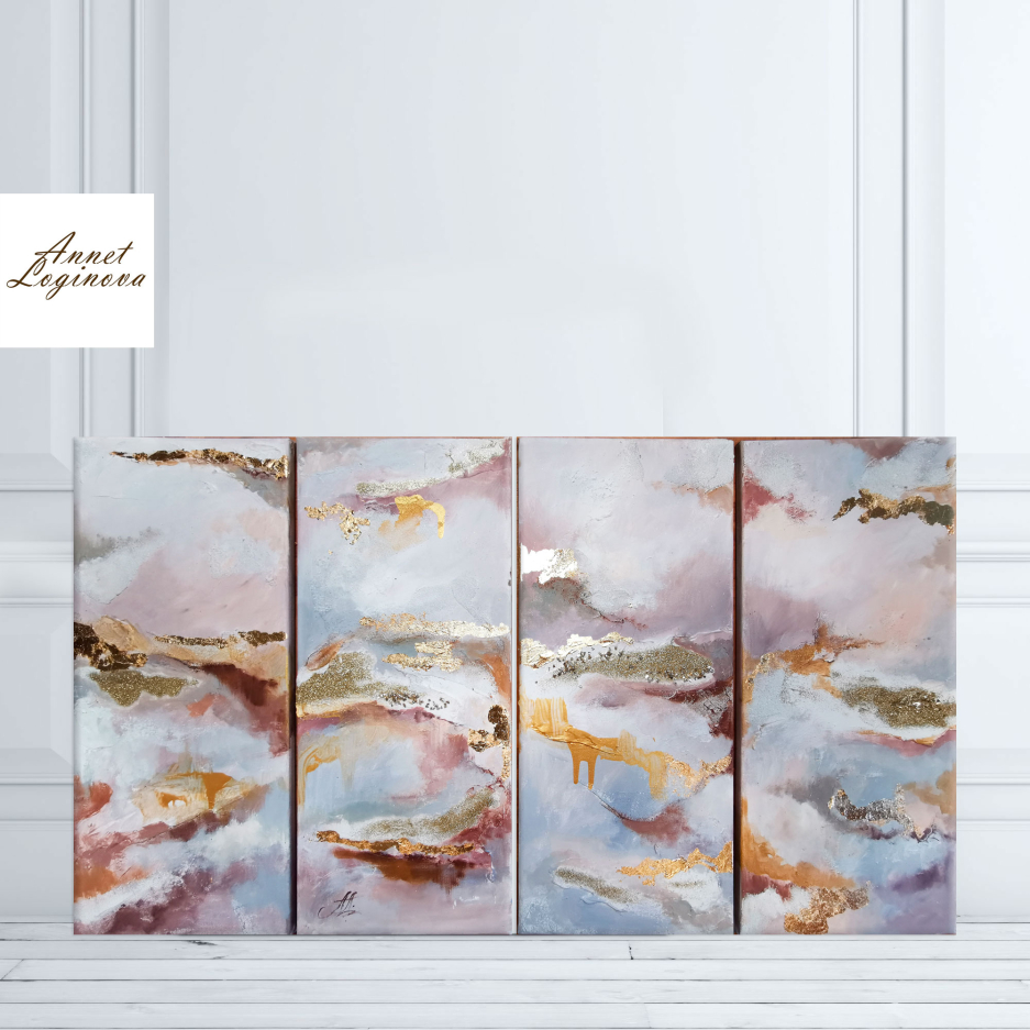 Set of 4 abstract paintings (quadriptych) with golden and silver pigments featuring beautiful shades of colors. This artwork, created with acrylic paints, metal leaf and glass beads, features a rich textured surface. The sides of the canvas are painted over and are a continuation of the painting.