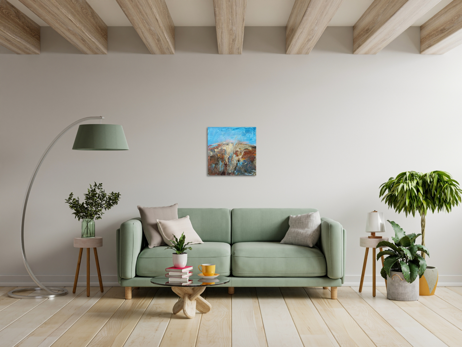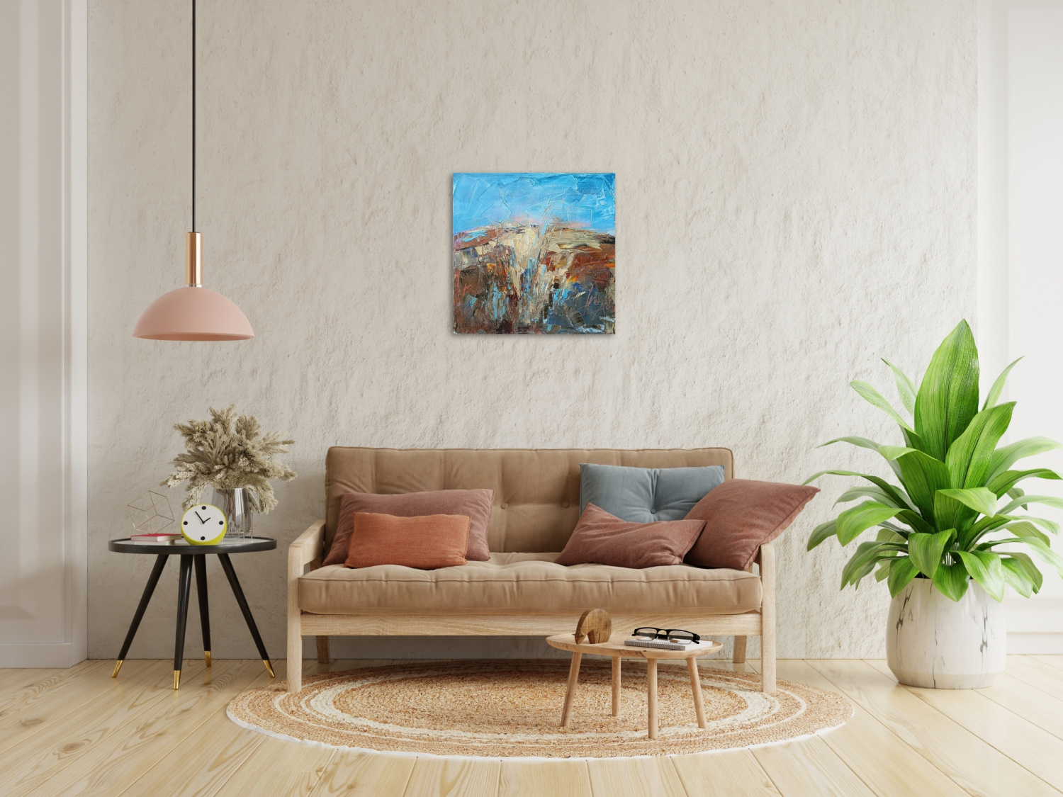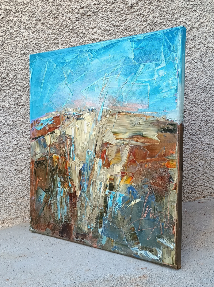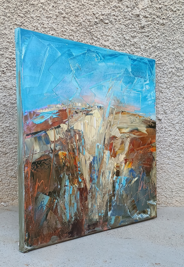 This original oil painting is made on stretched cotton canvas. Size is 40x40cm. Depth 1 cm. Canvas is gallery wrapped and painted on the sides, so the painting could be hang as it is without a frame if preferred.