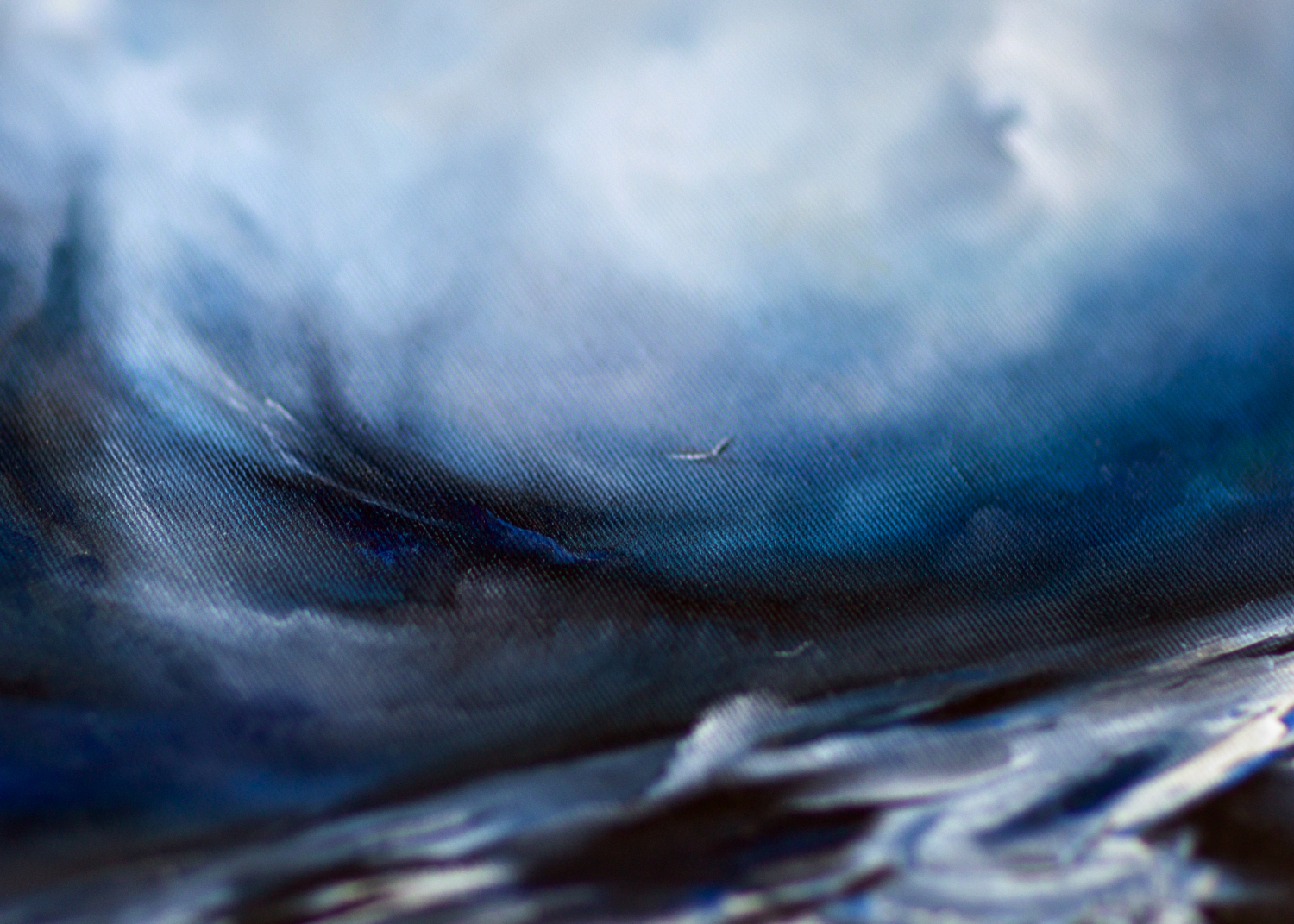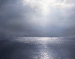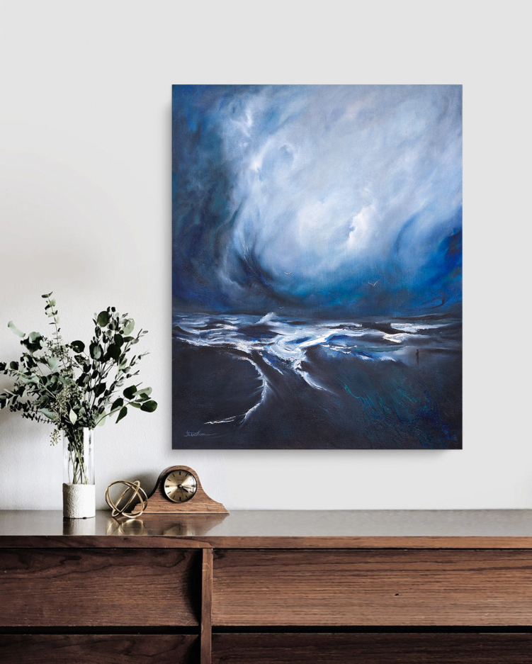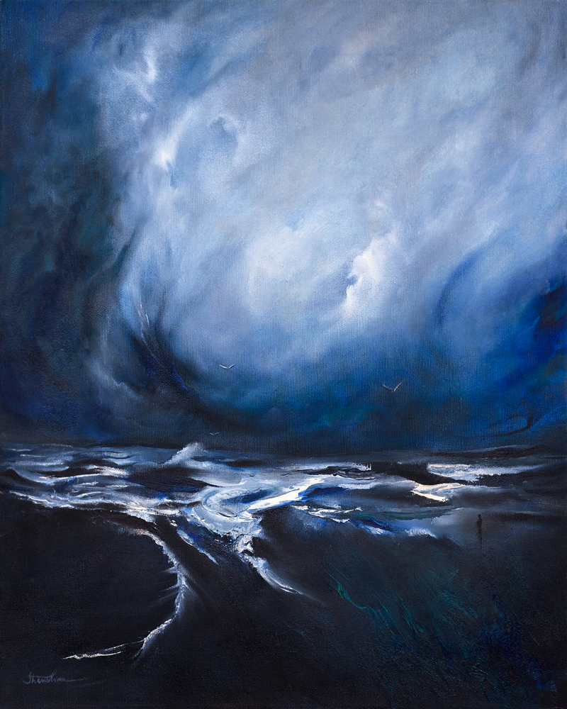 The vast sky dominates the composition focusing on a small figure observing the sky and sea. This canvas depicts the existential thoughts and humility of the figure accentuated with large expanses of color. The viewer is able to experience an array of emotions and to extend to the narrative with their own interpretation.