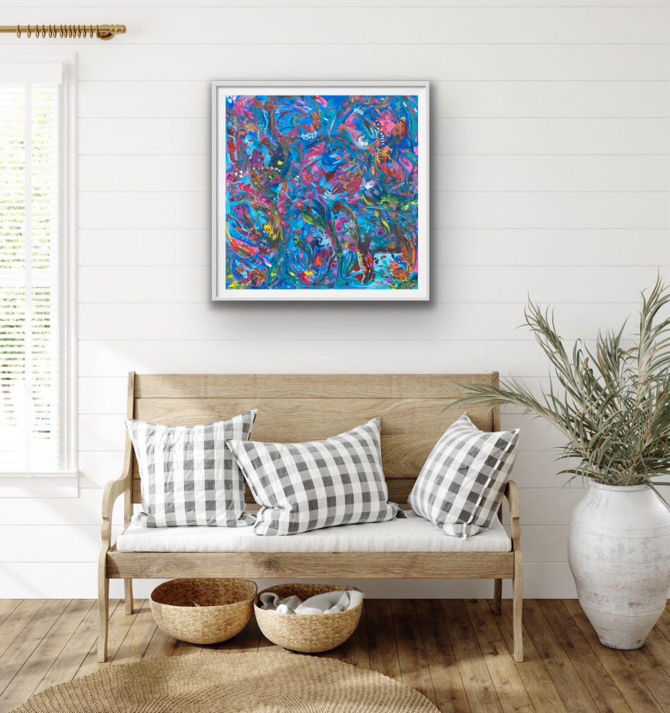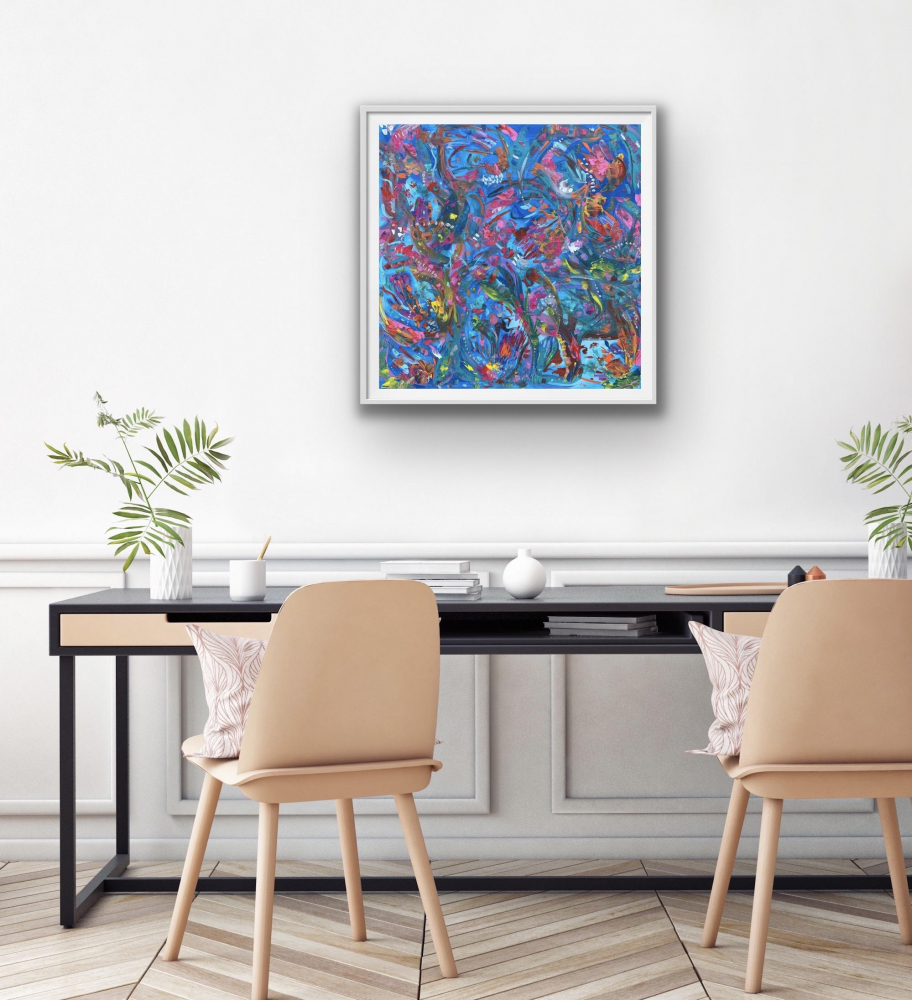 "Your living is determined not so much by what life brings to you as by the attitude you bring to life; not so much by what happens to you, as by the way your mind looks at what happens." Gibran“Season of her” is an acrylic painting made on canvas with both modern and abstract style. The combination of all these colors creates a positive and creative mood. An ideal choice if you want some joy in your space!