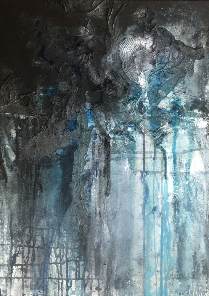 Abstract artwork made with collage technique and acrylic paints on cotton canvas. The glued elements add an additional texture. The side edges have been painted in black, so the painting does not require a frame.