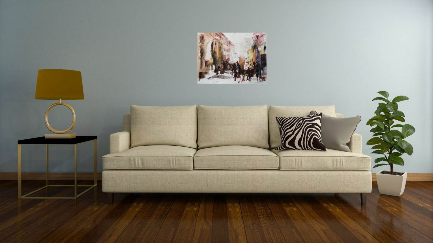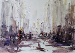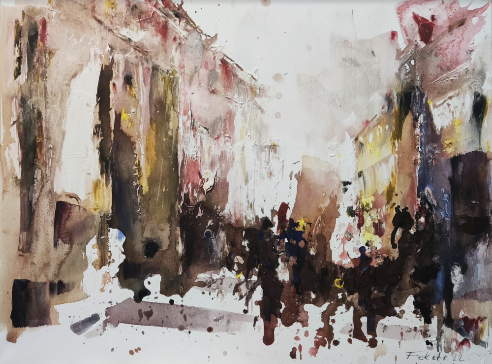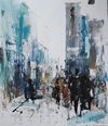 In this picture we can see a commercial street with small shops. People are in a hurry. The whole scene is painted very generously. The viewer can use their own imagination. With the technique of brush and spatula, the picture gets its own dynamic.