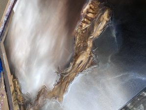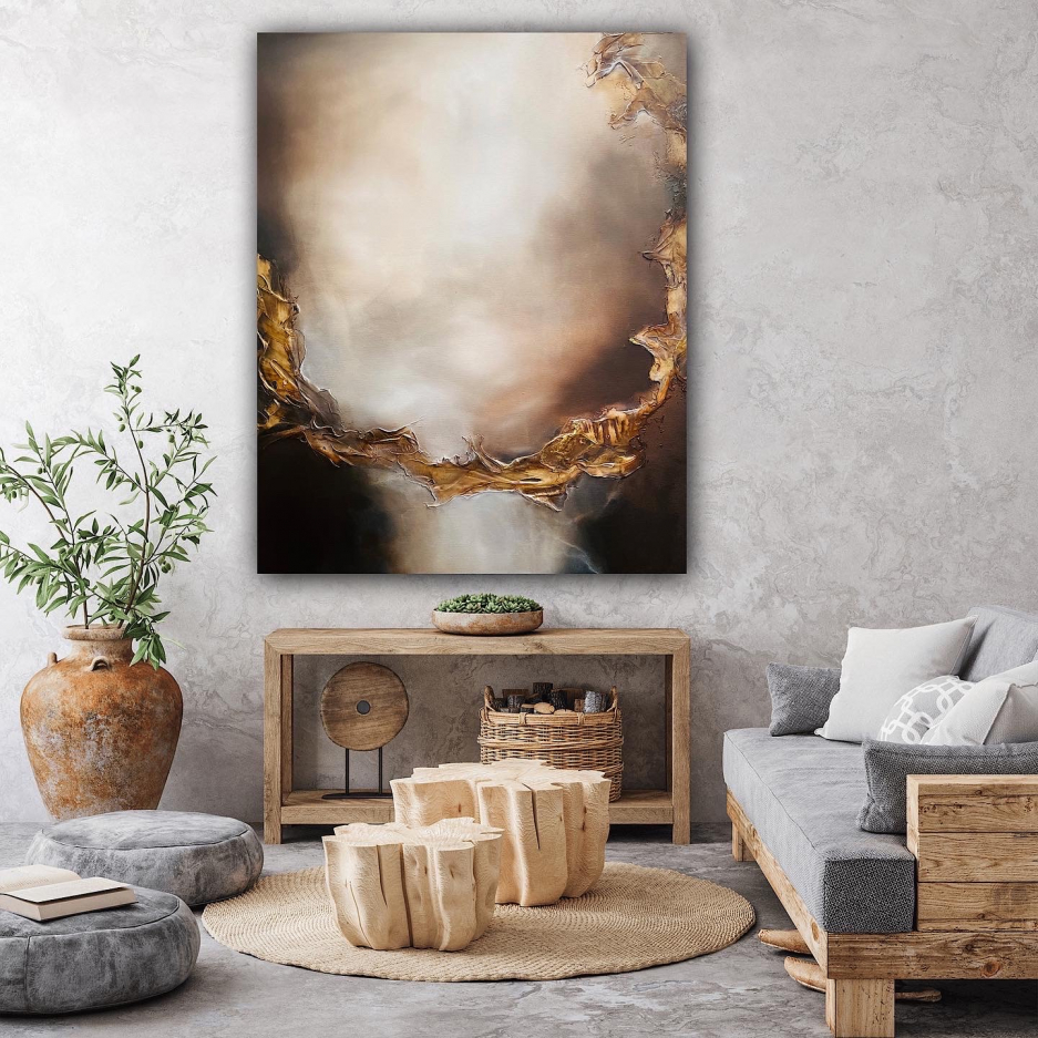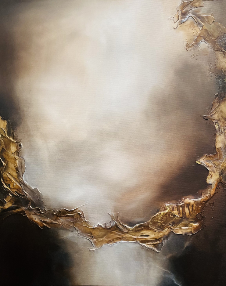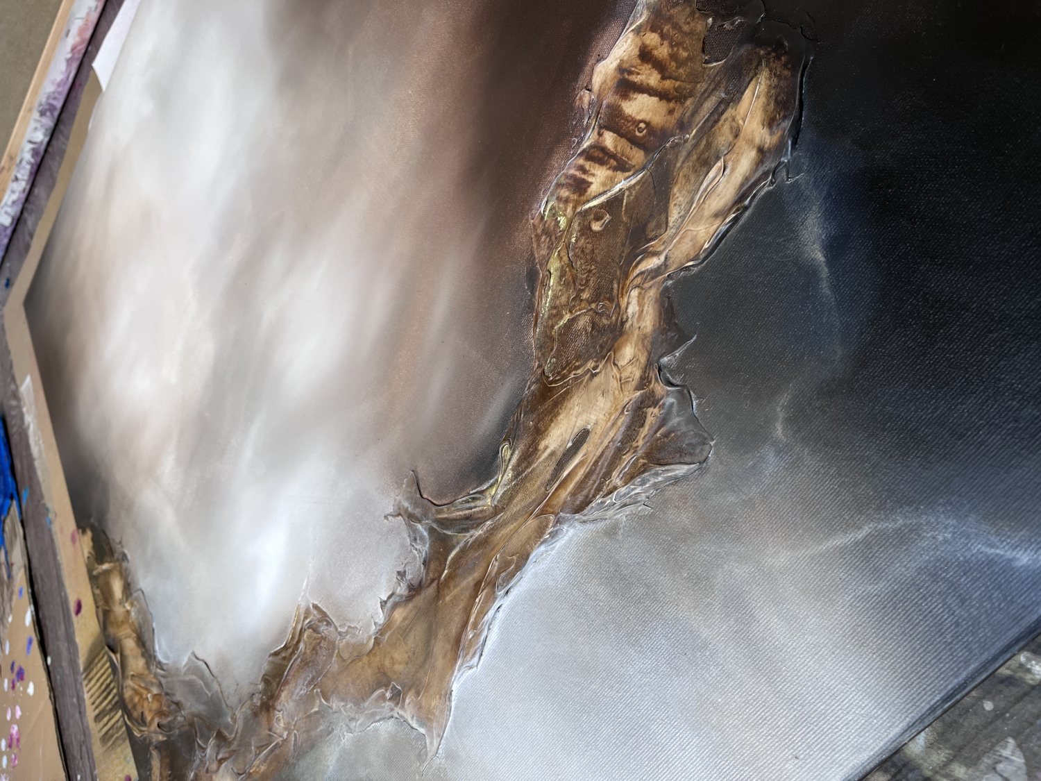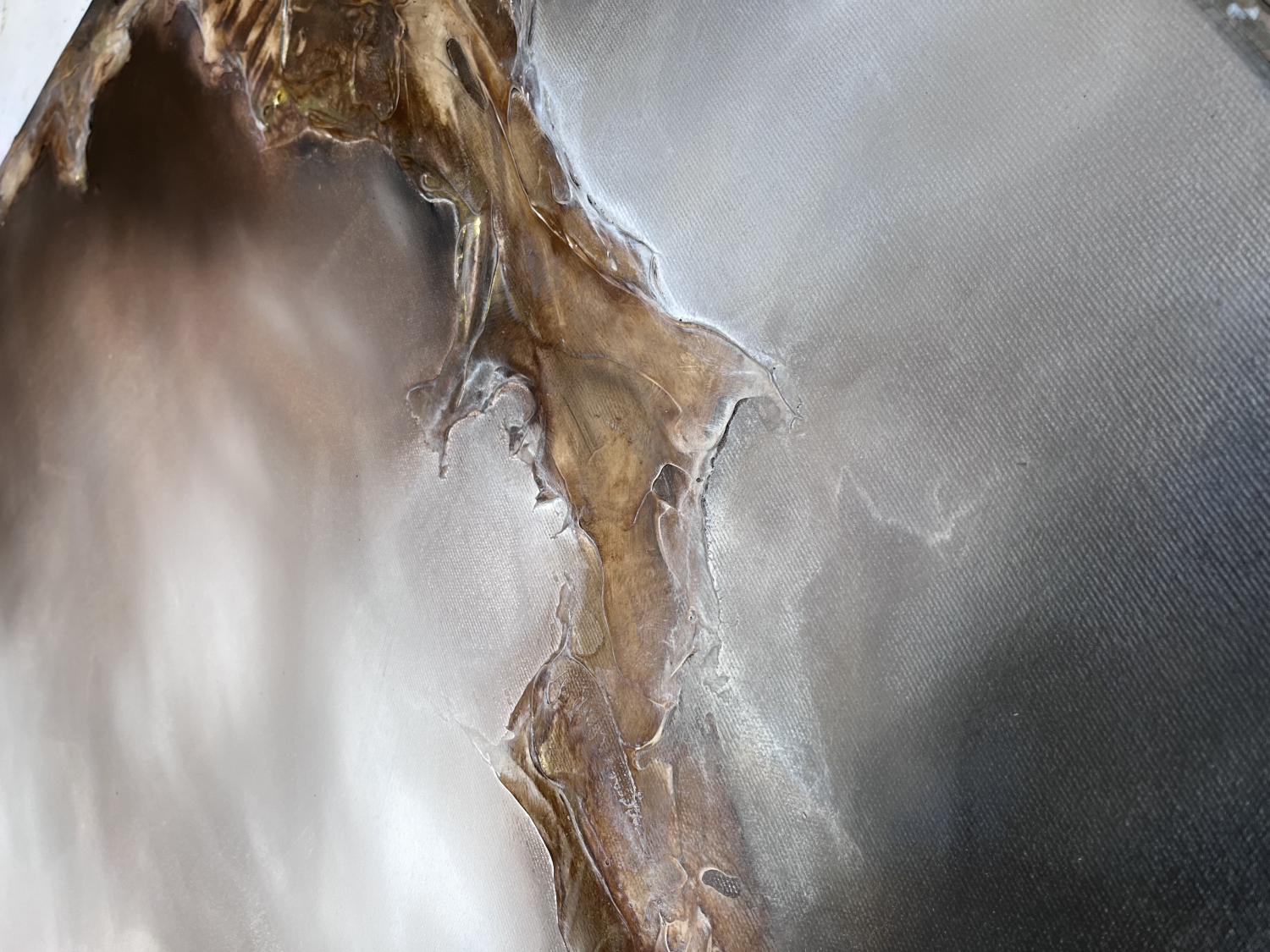 This art evokes a sense of calmness and silence. Gentle sparkling of air around. Just like the time before the storm. The texture on the canvas stands out and forms a plastic appearance.