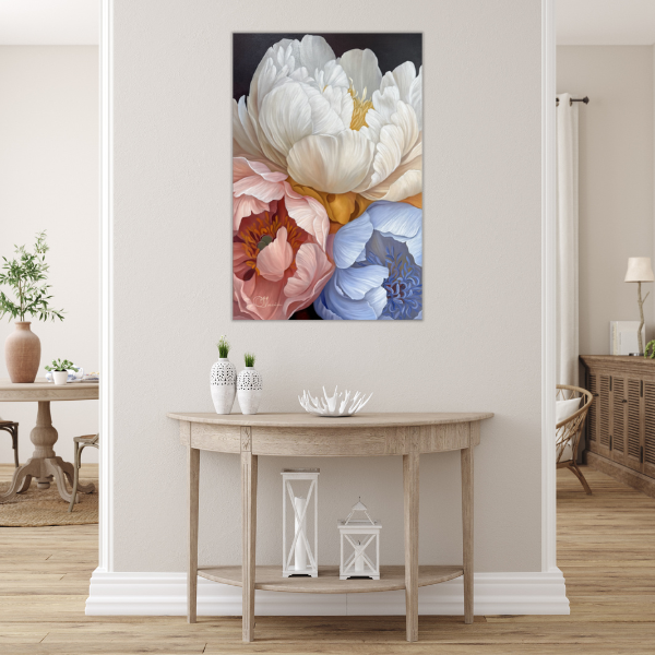 This artwork captures the delicate harmony of peonies in full bloom — white, soft pink, sky blue, and warm golden tones intertwine in a serene floral composition. Each petal is meticulously painted, highlighting the natural elegance, depth, and tranquil power of the flowers. An exquisite and timeless piece that will bring tranquility, beauty, and sophistication to any interior.