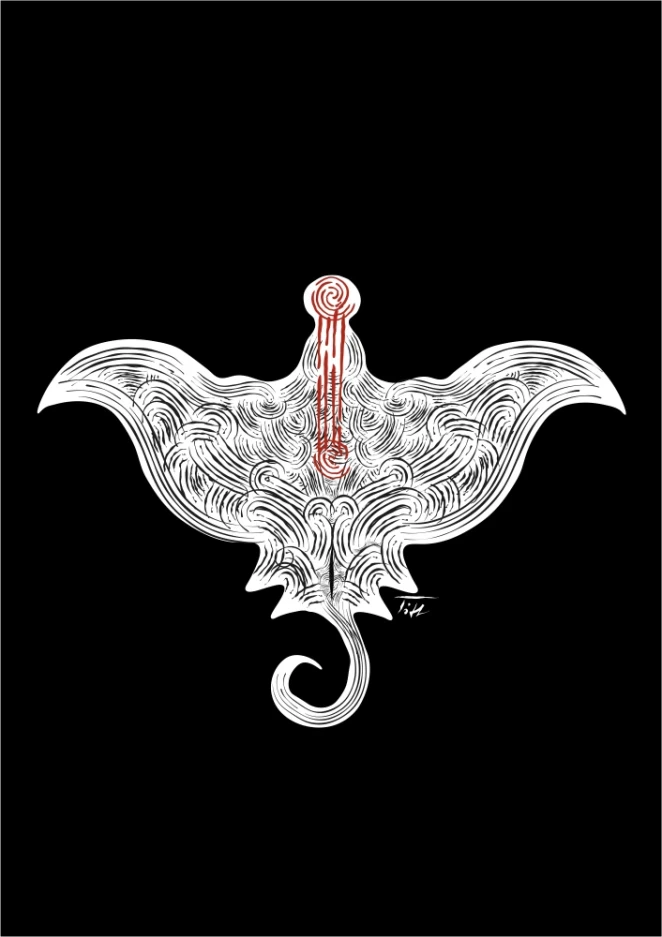 The skate fish symbolizes transformation and adaptability, particularly within Native American culture. The symbolism arises from the skate's ability to change its appearance and blend into various environments, reflecting the capacity for individuals to adapt to different surroundings reflects the potential for personal growth and navigate life's challenges. I wanted to highlight the grace and sensitivity to energy with curved lines and red circles. With twisting of lines I wanted to express fluidity as transformation journey of life. Its resilience is a reminder of the strength required to navigate life's challenges gracefully. With their hunting style teach that success often requires time and careful effort rather than haste.