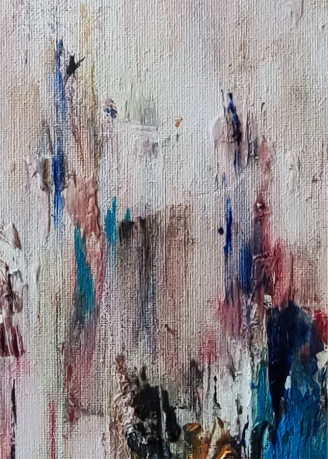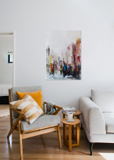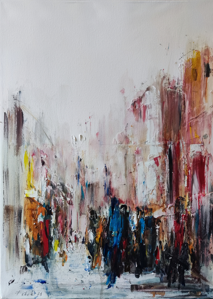 It fascinates me to harmonize the colors. A colorful palette of colors is good for my soul especially in the gray days of the year. I painted this picture in warm colors. It is a motif from the city where I now live and rent my studio. I started painting on the white canvas without knowing what the result should be. My inner eyes and the current mood brought me to this scene. It is a dramatic atmosphere full of contrasts, with dense on the right and a teaching on the other. The shapes are vertical classification so that the eyes of the viewer slide from top to bottom and the perception of depth arises. One can only guess the standing figure on the street. The set colors supported the satisfaction and pleasant mood.