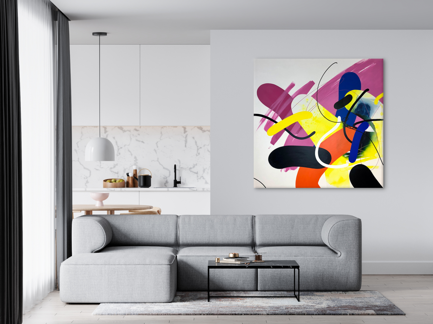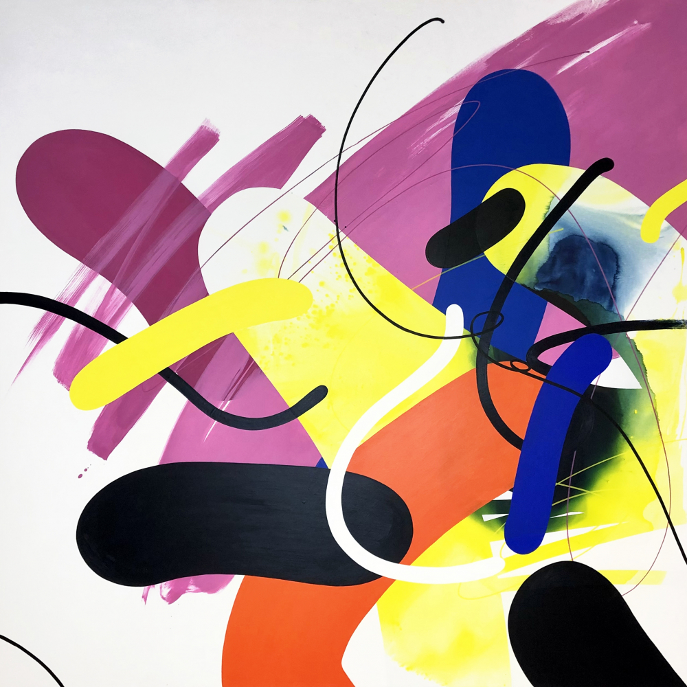 The artwork is permeated by the fascination with lines that develops into an infinite variety of shapes in an abstract composition. The colorful abstract painting will brighten up the living room area.