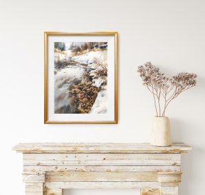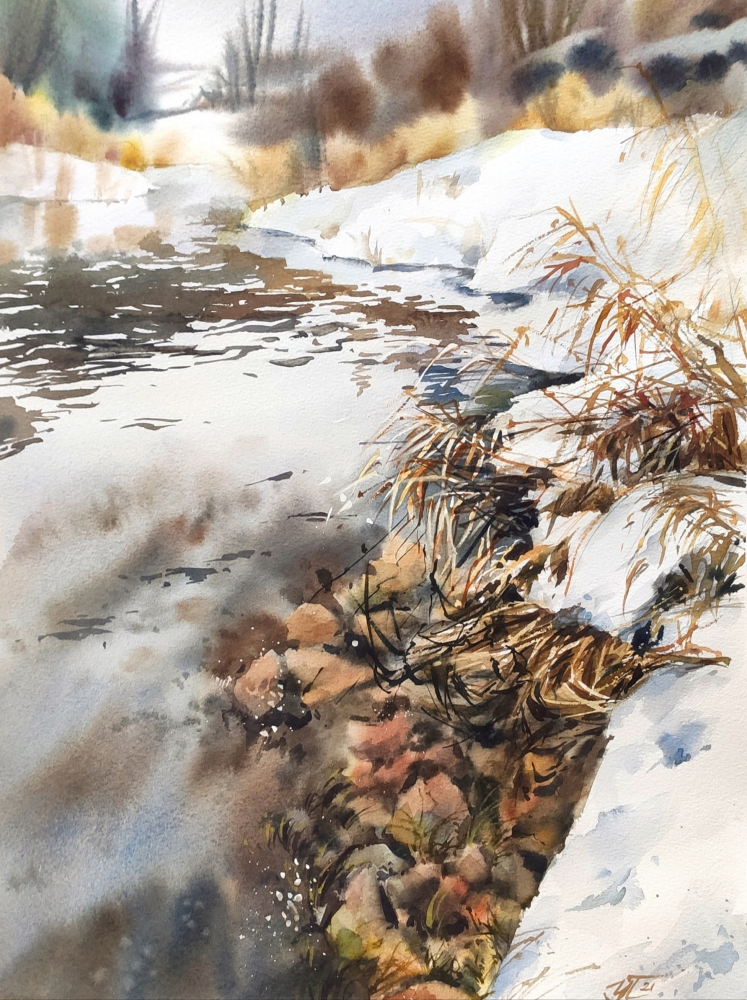 Painting with winter country landscape - river and autumn florals on the shore. This watercolor painting made in brown, grey and white colours - last winter in Russia was in these colours, and they are also very deep and expressive for me) This winter landscape painted on the cotton watercolor paper and signed on the front side.