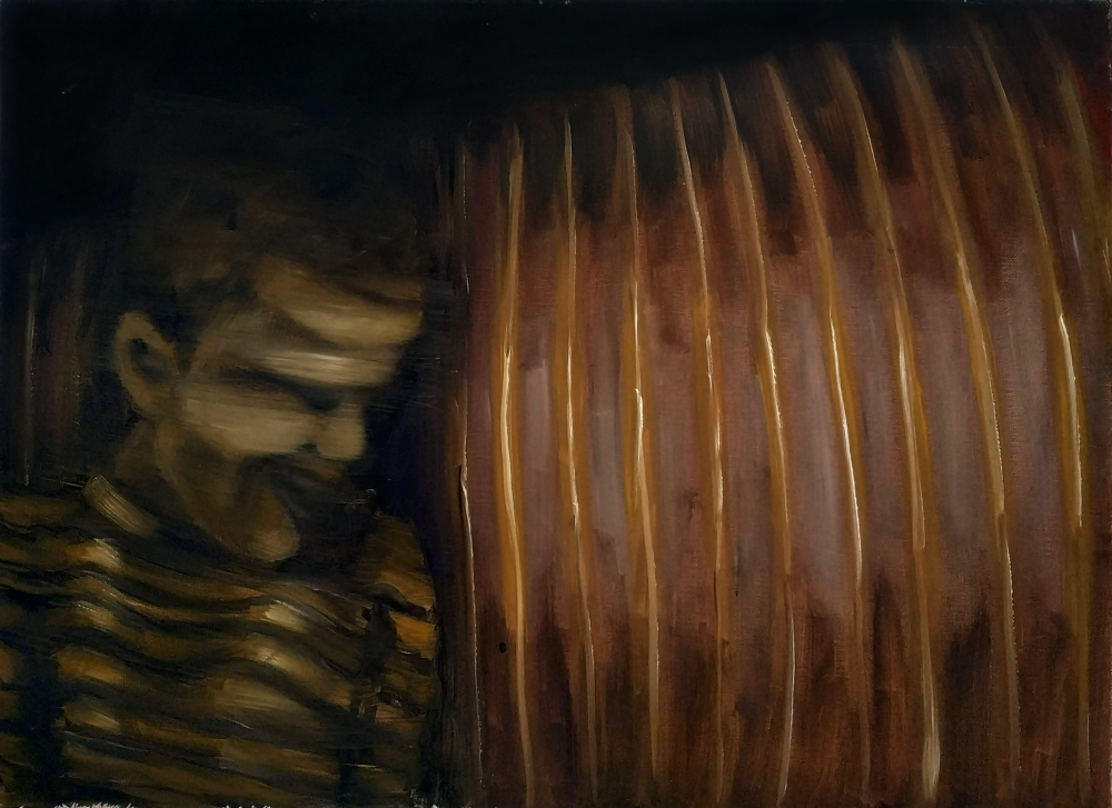 This is my cousin who really twitchy. The pillow behind him was stripped and I realized that his shirt is stripped too, however another way and I liked that so I ask him to stay there for a minute to take a photo, but he always moved. This is an interpretation of camouflage.