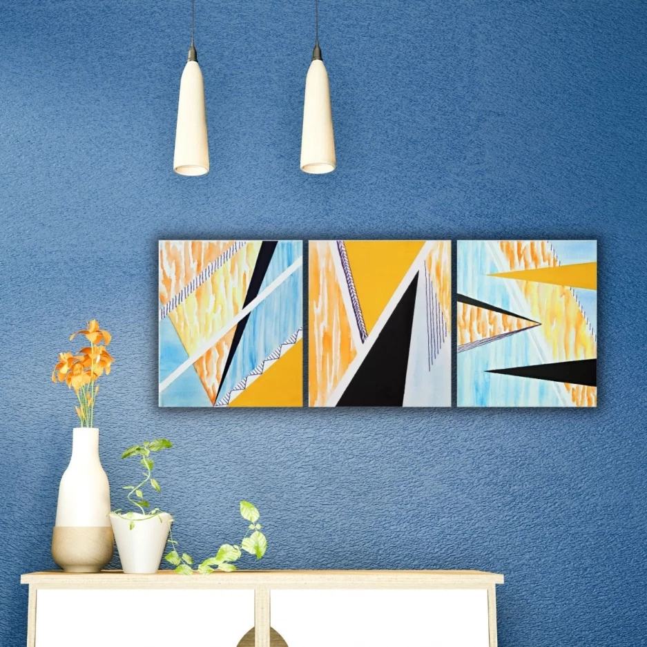 This art piece is a painting which follows abstract style. This artwork consists of 3 different canvases (each of the canvases is 25x 30 cm). The artwork is made with mixed techniques and specifically with a combination of acrylic, watercolor and sewing.