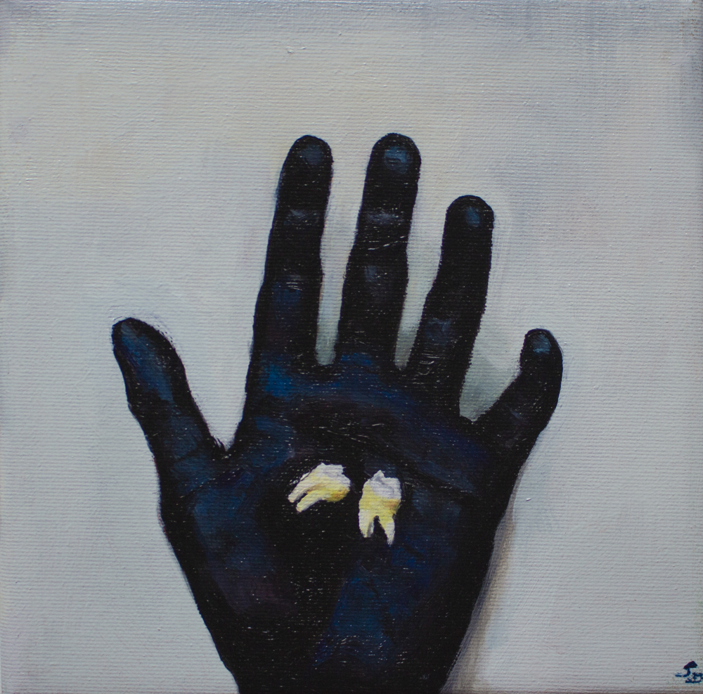 In this painting I wanted to incorporate the classical dream-theme of fallen out teeth with something different and create a little disturbing, surreal image.