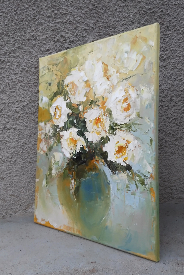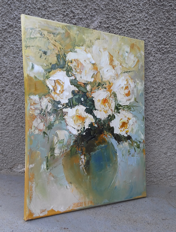 This original oil painting is done on stretched cotton canvas. Size 40x50cm. Sides of the painting are painted so it is ready to hang without a frame if preferred.