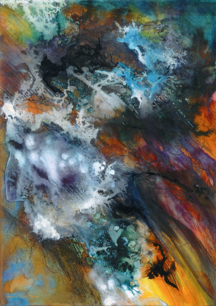 In the cosmic chaos of creation, out of the abstract mixture of colors and lines, the human profile begins to emerge, possibly the dream of the first human, projection of the future to come.