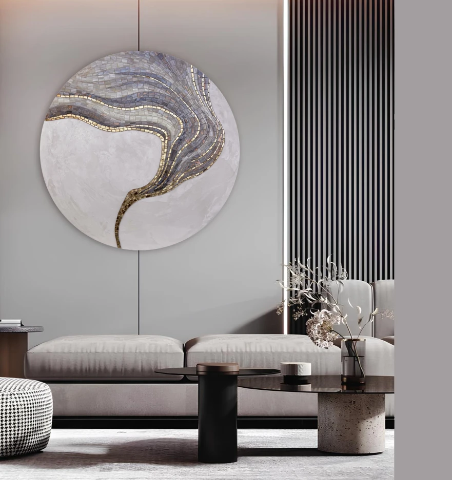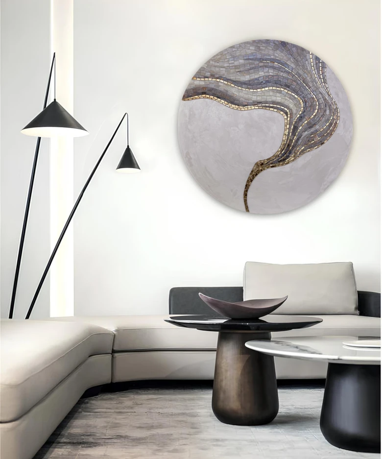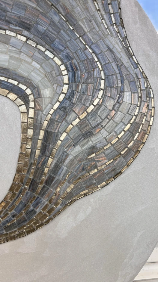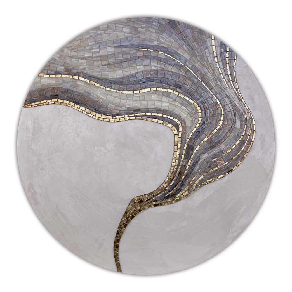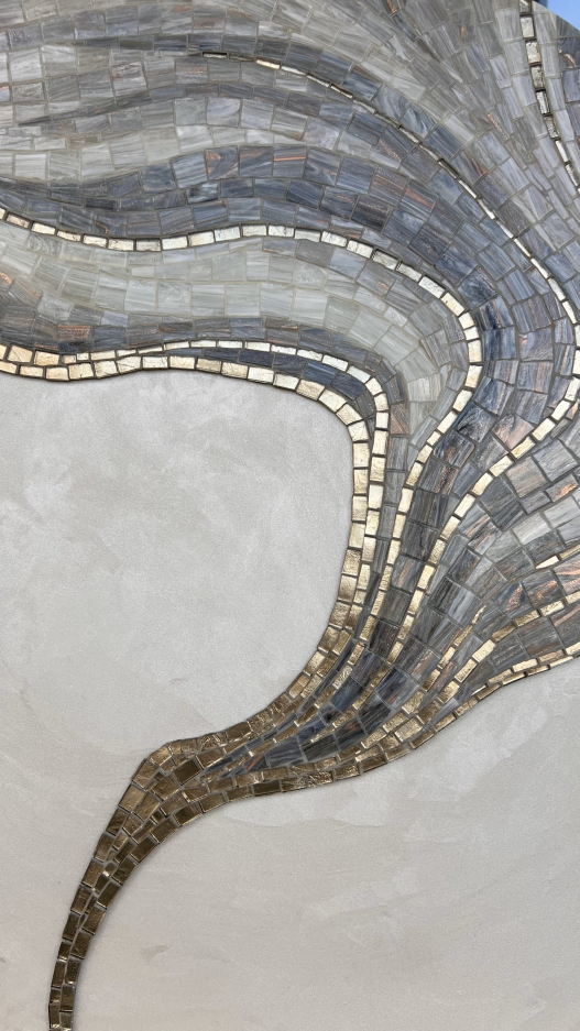 Created with hand-cut glass mosaic in grey and golden colours. The background is "silk" paint.