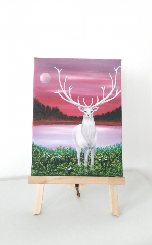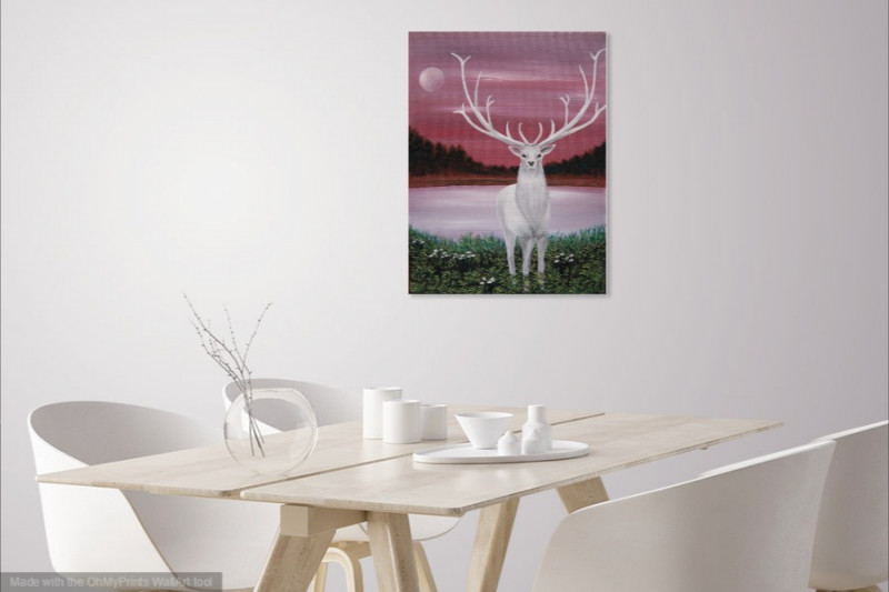 “The Ruler” is one of the paintings of the “Ruler” series. This series consists of oil paintings with surrealistic style and were created on canvas. They are inspired by nature and they illustrate a reindeer in different places. All the paintings give you ethereal vibes and create a magical atmosphere. In this painting the reindeer is in a lake with a beautiful pink sky.