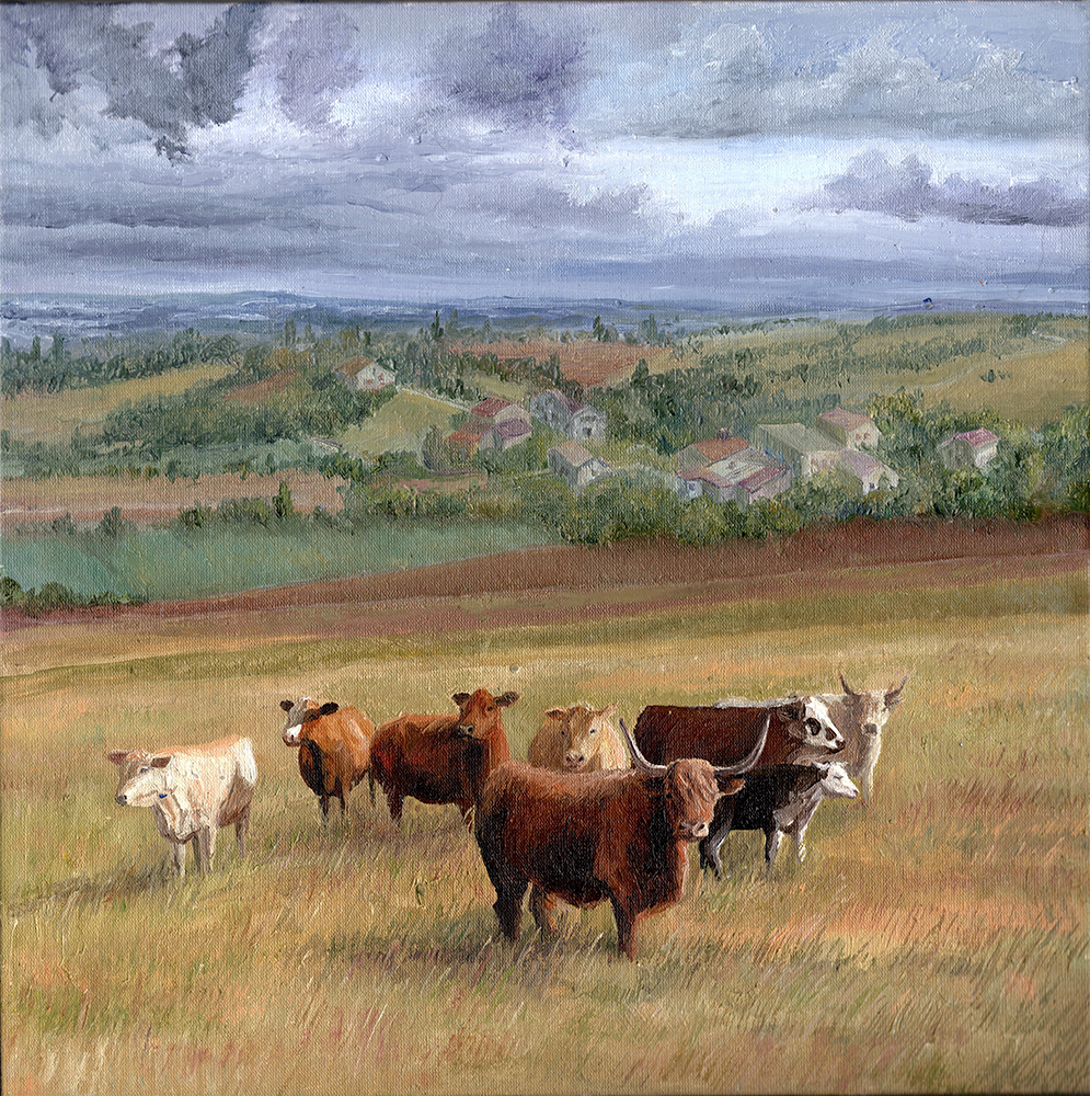 The cows graze peacefully in the field. Picture from the series "peaceful sky"