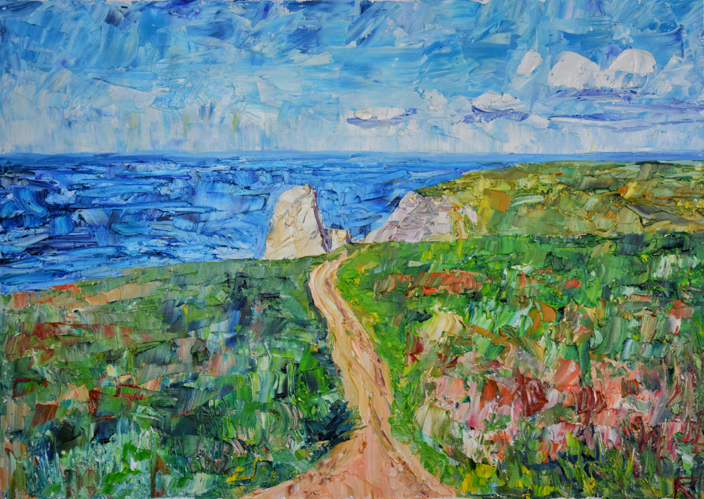 Marine landscape original oil painting on canvas with the most western point of Europe. Capo da Roca is a beautiful cliff in Portugal, where land is finished and the sea stars.
