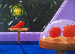 So that's where my inspiration for vegetables, fruits, herbs and spices is coming from. And now in the future I have my own vision and plan how to take over the torch and light a new path in a combination with art. So in this art pieces are depicted 3 generations of onions, from the seeds in the back put into a vase. To the young onions occupying the painting on the right wall. And the fully grown onion in his prime on the left side.