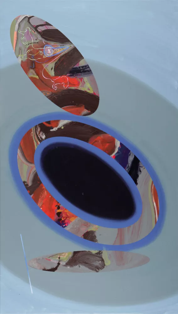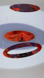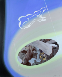 This cycle of paintings is about the meaning of human life. About leaving a trail of universal earthliness, and through personal, spiritual, and individual experience connect with the universe on a deeper level. Each artwork captures different eclipses of the universe, in which there are various earthly or dreamy motives that interconnect with the celestial elements. Around the borders of eclipses, there are subtle lines- whether we call them revelation, spirit, or energy- that basically create an idea of a cosmic funnel through which this interconnection between universe and earth flows.