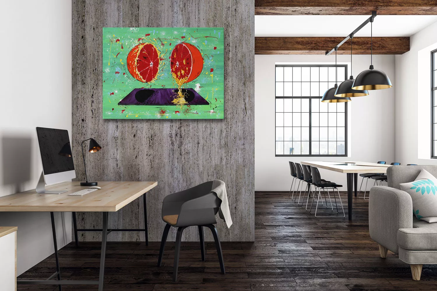 Trippy orange is a modern acrylic painting on canvas that represents elements of nature, two oranges. With this painting, the artist is aiming to tell that we all have the tendency to let ourselves loose and on the other side to obtain our inner peace. With its abstract style and its great size of 60x80 cm, it would fit perfectly in any space and would fill the emptiness of a room!