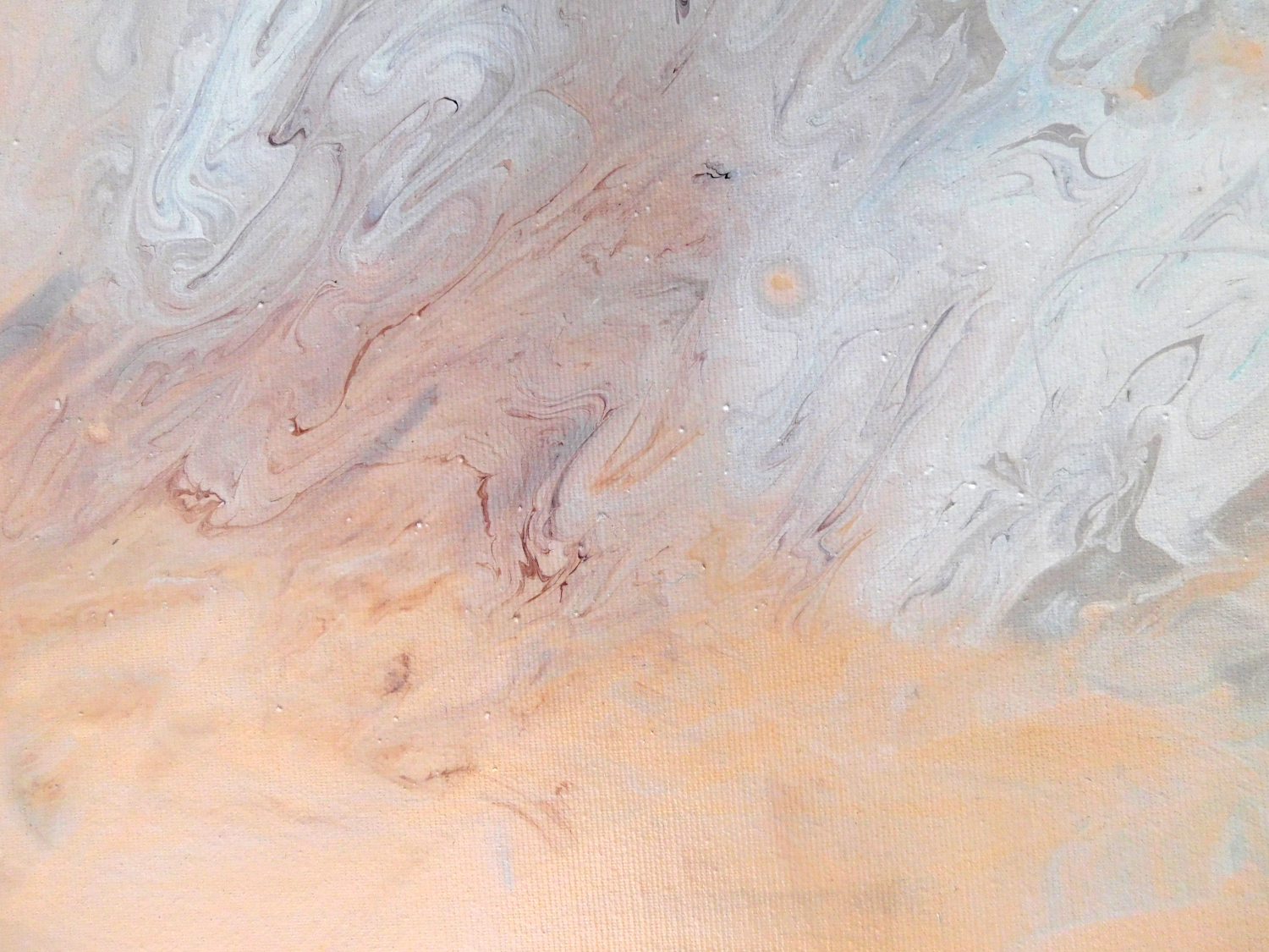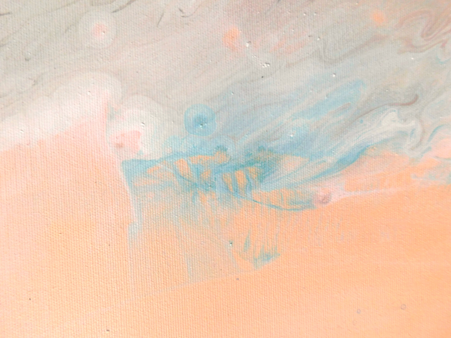 The fluid art technique appealed to me, because it is a method in which the final result cannot be fully controlled, leaving room for surprises, chance, risk and improvement. The works contain collages made with acrylic colour, spontaneous splashes and matte flat strokes.