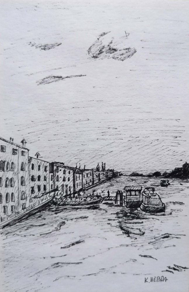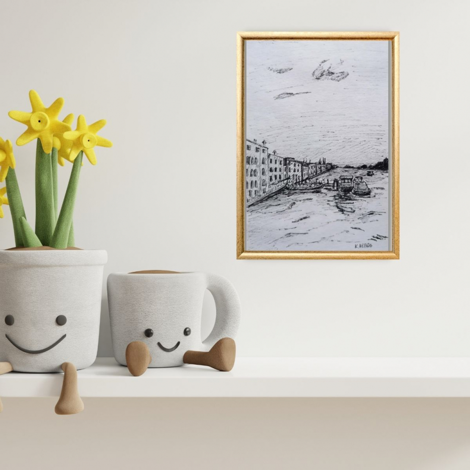 This is Venice, and the drawing takes us back to its magic, its canals, the overdose of beauty and wonder, splendour and richness of art, sounds, and light... that no words can actually contain.