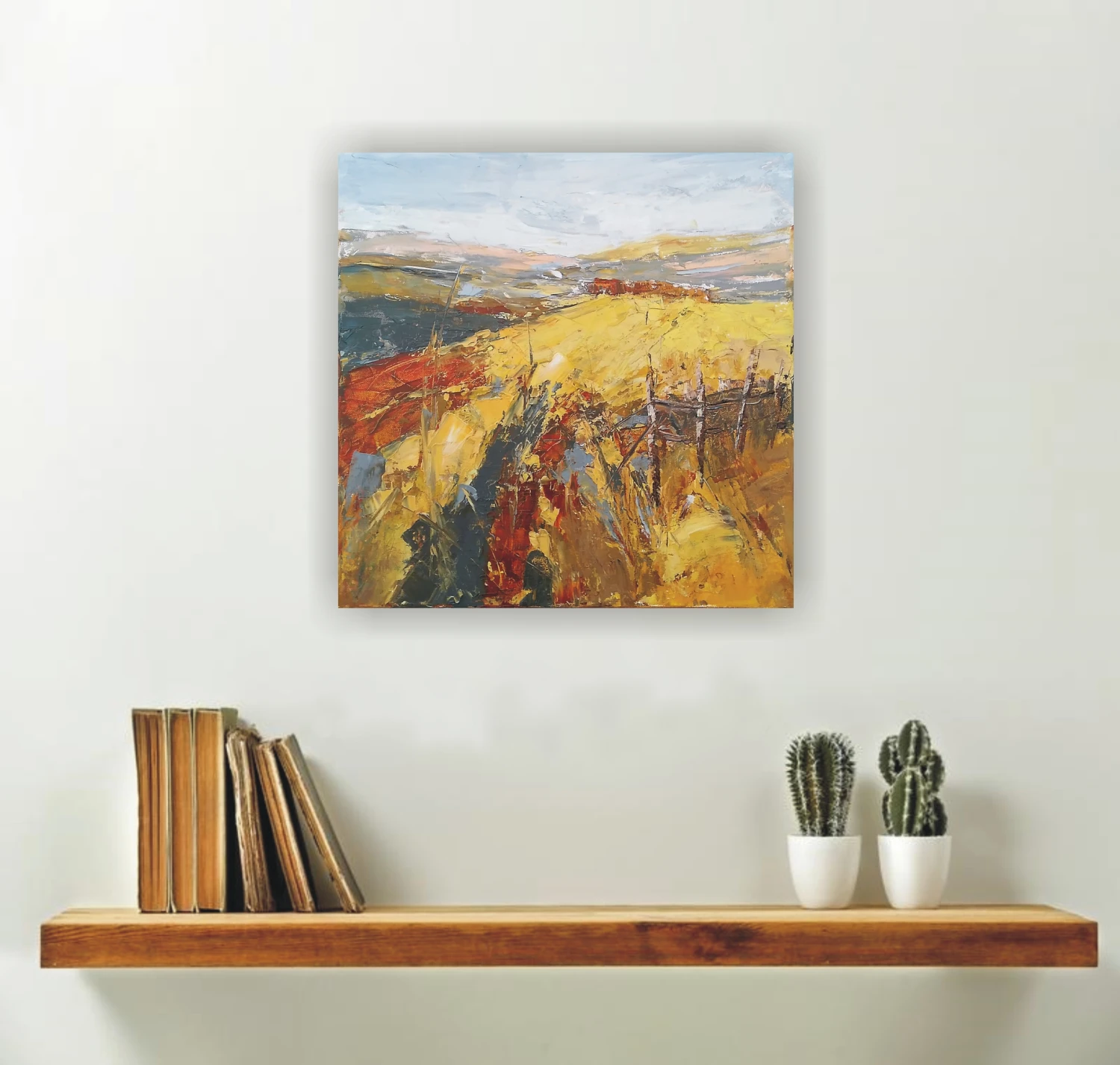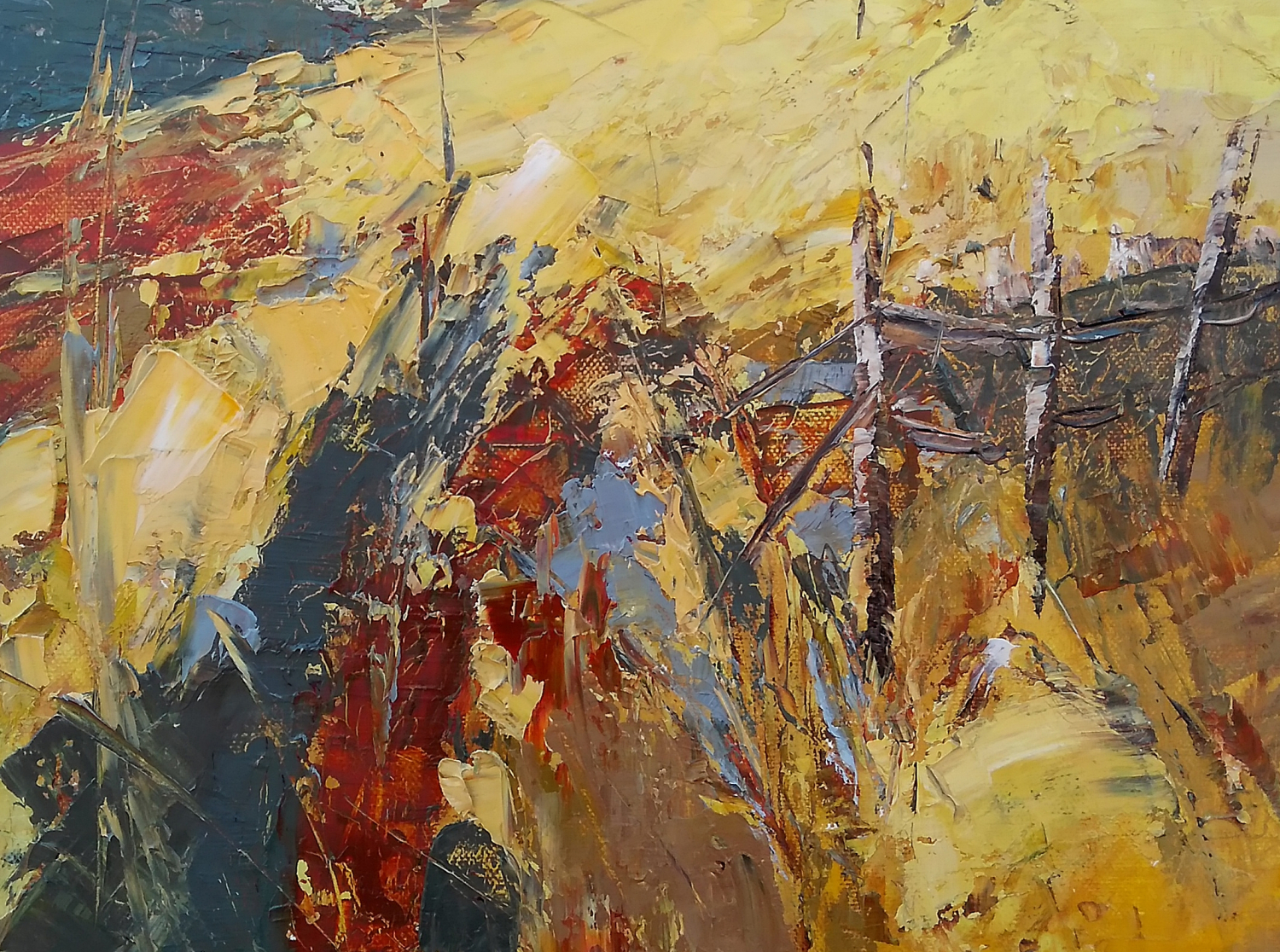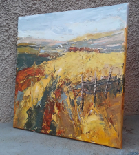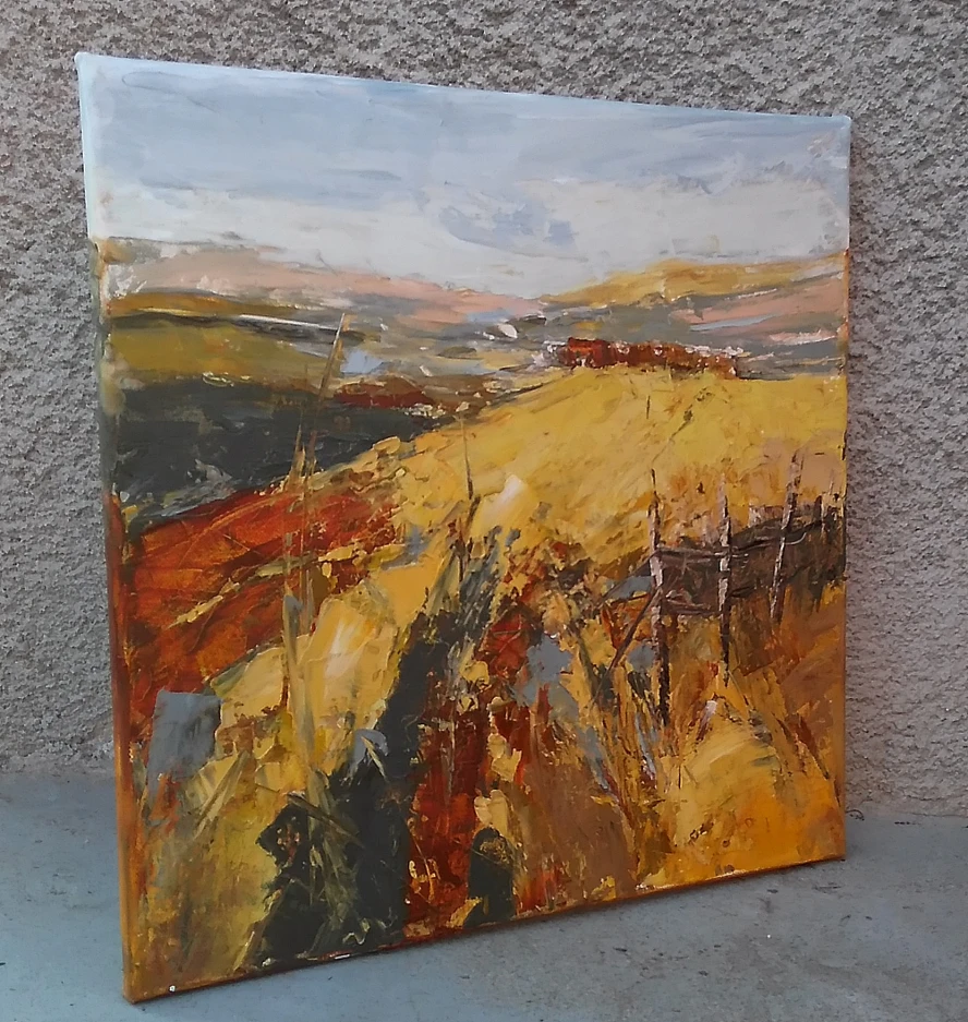 This painting is part of my field series. My freedom-loving personality was always been drawn by the fields. I love the feeling of endless, freedom and reverie that the fields evoke in me. I love painting them. While painting I feel the gentle wind playing all around me, I hear the whispers of the grass, I feel my soul floating towards the horizon… and I am happy. Hope you are too when looking at these paintings.