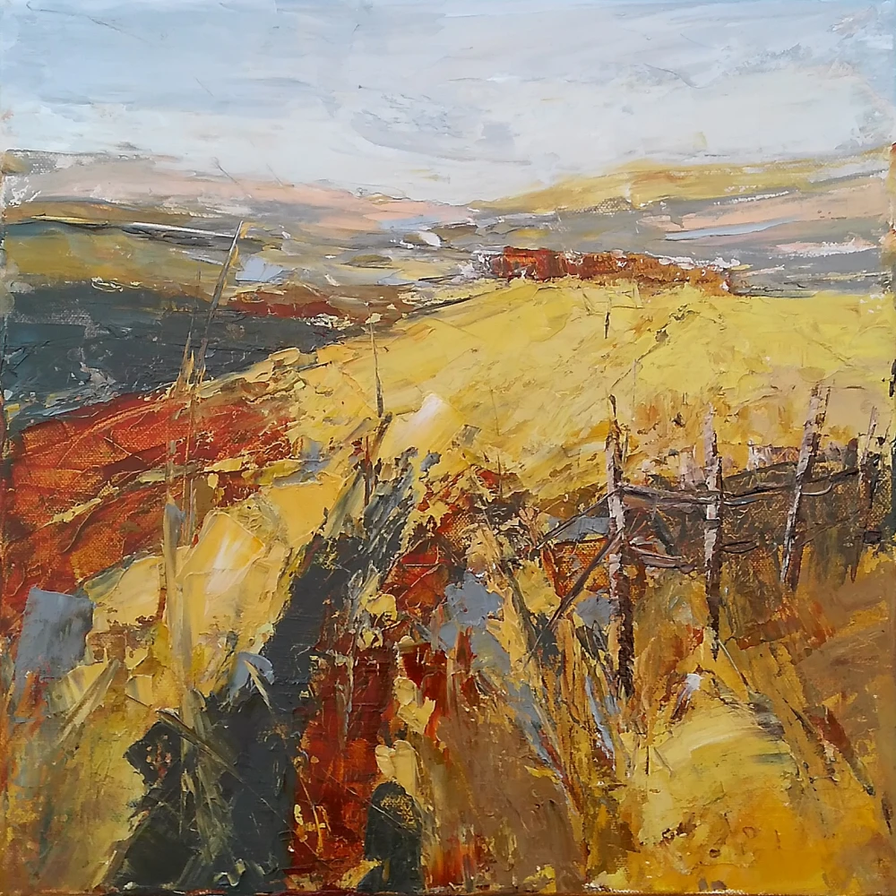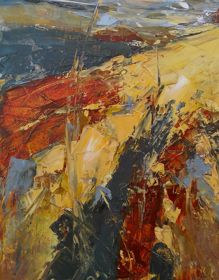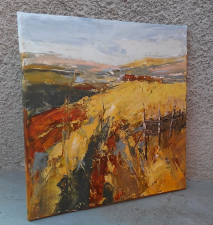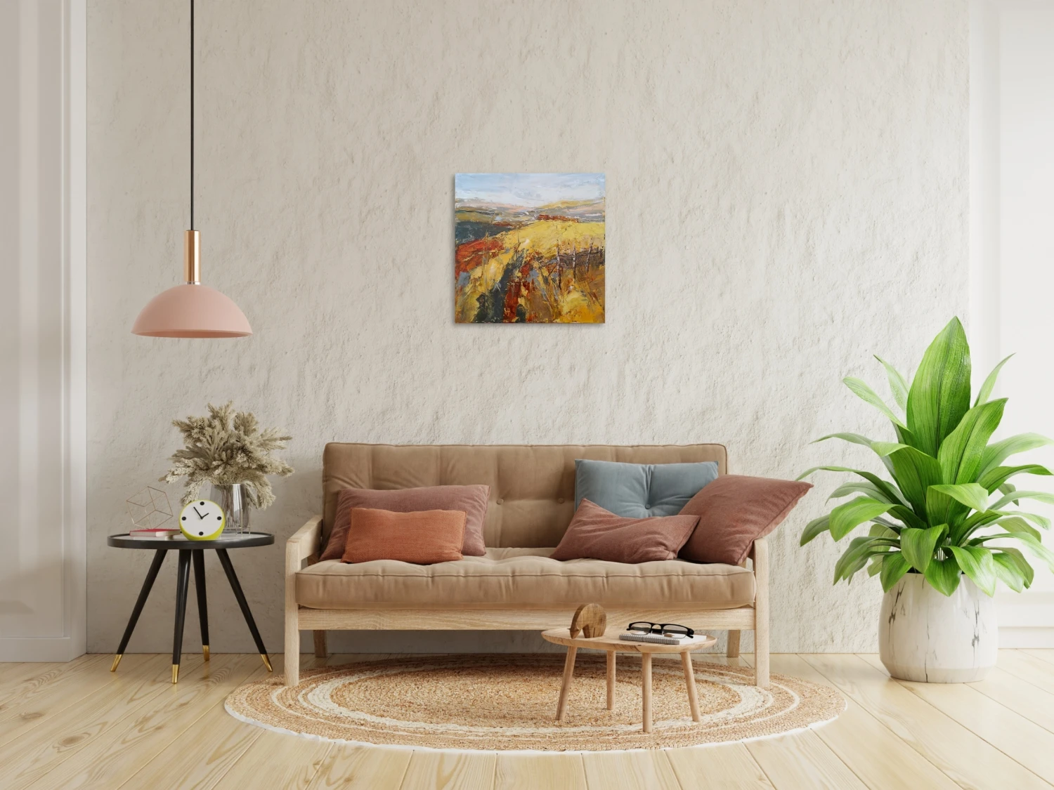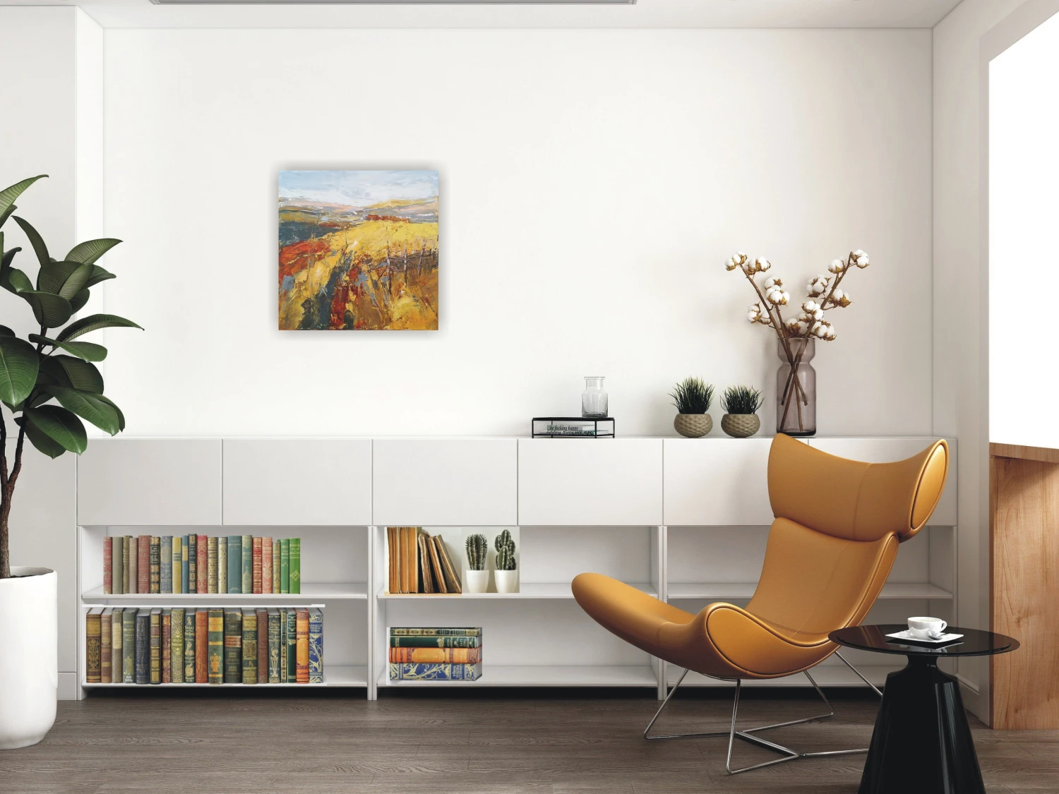 This painting is part of my field series. My freedom-loving personality was always been drawn by the fields. I love the feeling of endless, freedom and reverie that the fields evoke in me. I love painting them. While painting I feel the gentle wind playing all around me, I hear the whispers of the grass, I feel my soul floating towards the horizon… and I am happy. Hope you are too when looking at these paintings.
