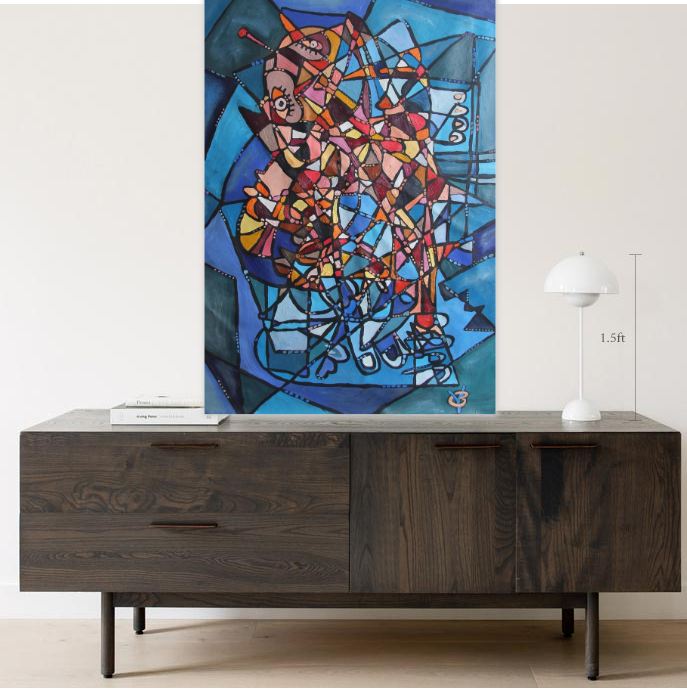 “Whiskey and blues” is a surrealist abstract painting created with oil on canvas. Being a cubist piece, the form is highly abstracted, leaving the viewers to interpret the artwork themselves. The complimentary colors of yellow/orange with blue juxtaposes each other, separating the foreground and background while making the painting more fascinating. The intrinsic and complicated shapes are balanced with the limited color palette, making the painting fascinating yet not overwhelming.