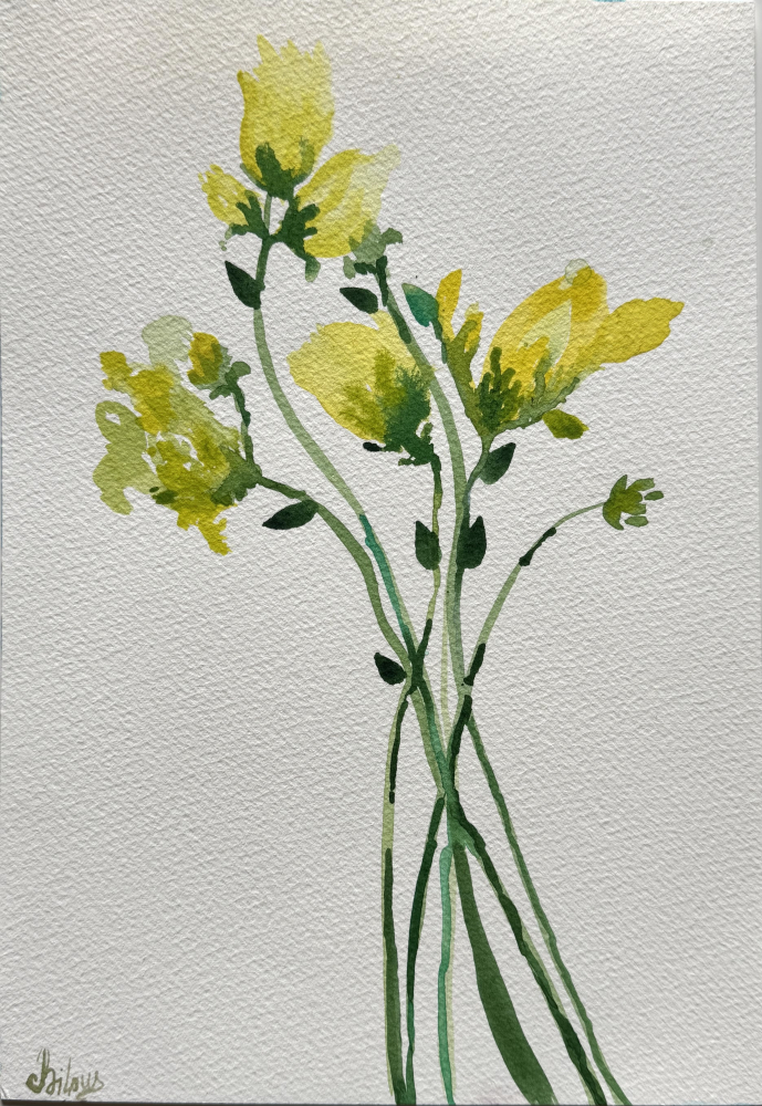 This delicate watercolor painting captures the effortless beauty of wildflowers in bloom, their golden petals dancing in the light.