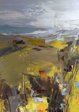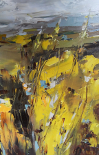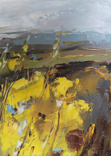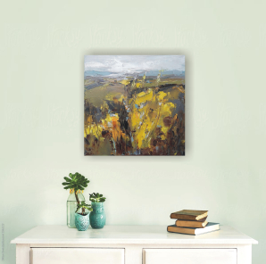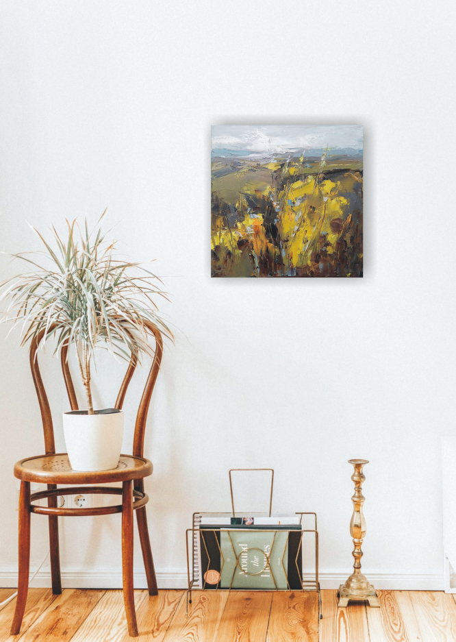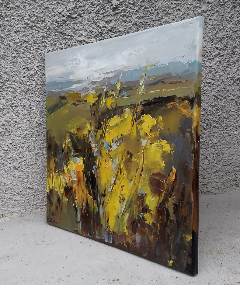 This painting is part of my field series. My freedom-loving personality was always been drawn by the fields. I love the feeling of endless, freedom and reverie that the fields evoke in me. I love painting them. While painting I feel the gentle wind playing all around me, I hear the whispers of the grass, I feel my soul floating towards the horizon… and I am happy. Hope you are too when looking at these paintings.