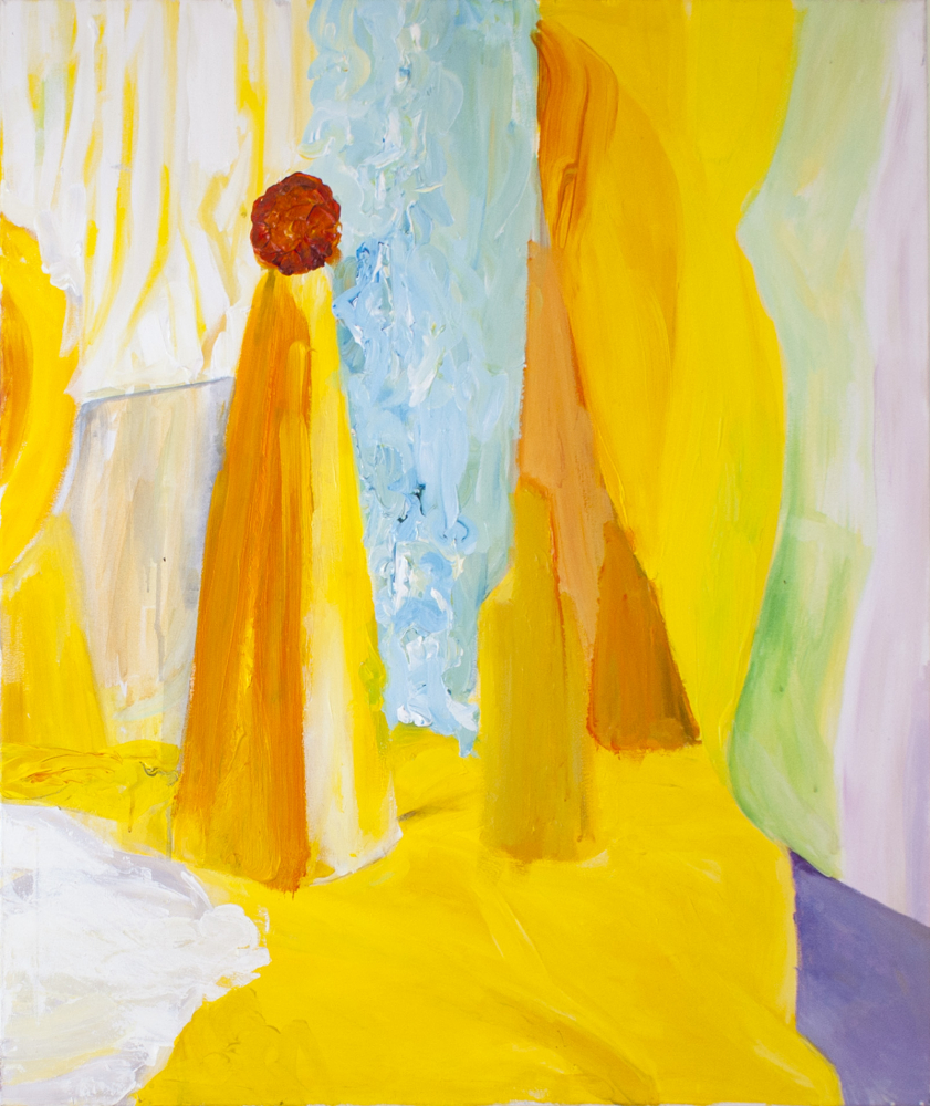 Abstraction inspired by nature, created on the basis of still life. Optimistic, a light composition created with expression. Made mostly of yellow and orange, but the eye-catching purple appears to be the dominant color. The different structures of fabrics and other elements create an interesting impression for viewers, the variability of these structures is determined by the elements presented. The composition sparkles with a warm shade of yellow drapery.