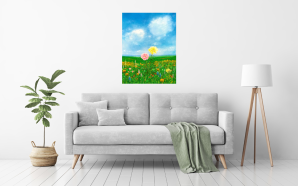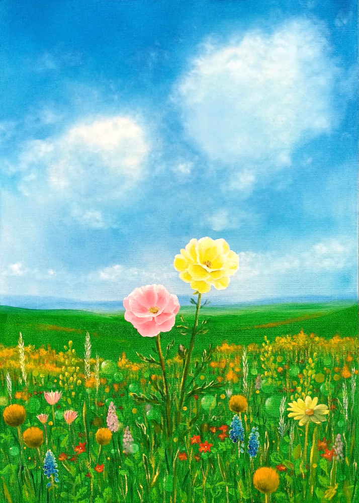 Blue sky with white clouds, light and fluffy - represent carefreeness (lightness of being). Deep green grass is a symbol of health, a healthy foundation. And two flowers in the foreground express the connection, the affinity of two souls.