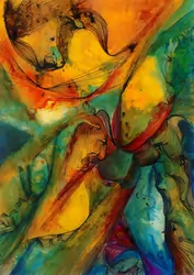Constantly experimenting with colours, techniques and textures to best show the emotions. I use very often synthetic gold in my painting to show light of energy. This is why very often my paintings do not fit within the framework and often go out into space.